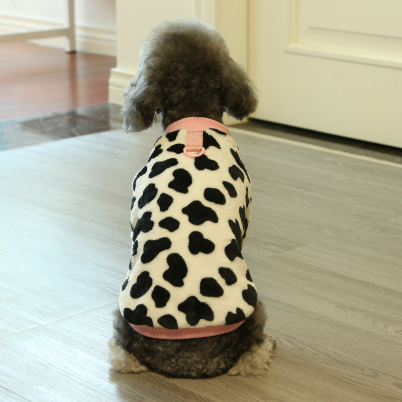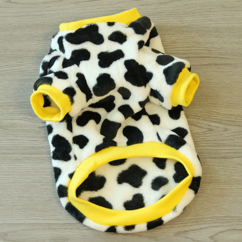 This flannel pet outfit is designed for everyday wear during cooler seasons, featuring a soft fabric texture and a playful cow-inspired design. The fleece-style material provides a comfortable feel suitable for routine indoor use or casual outdoor activities in autumn and winter.
